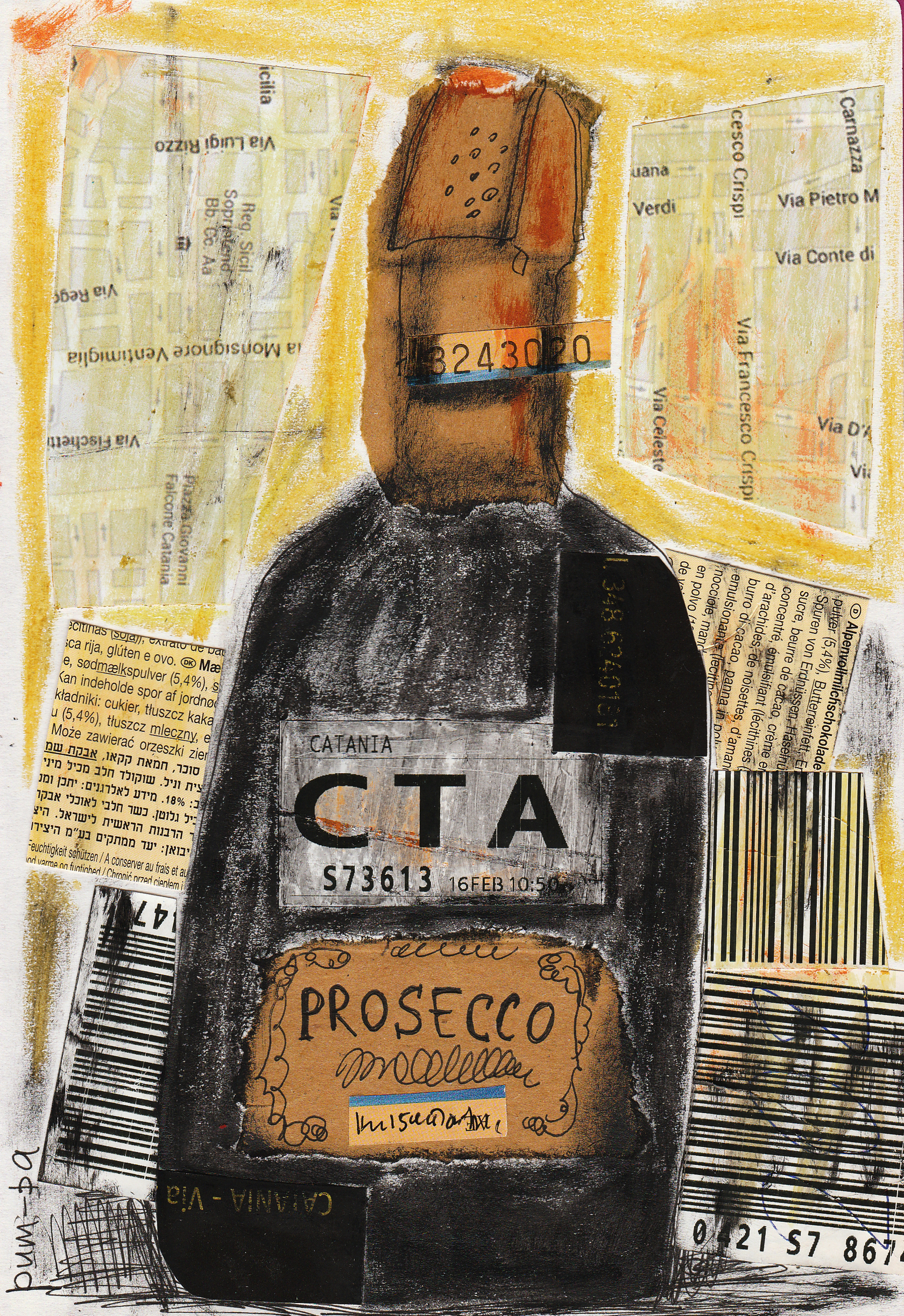 A bottle of wine at the heart of a visual story — a collage of taste and texture.