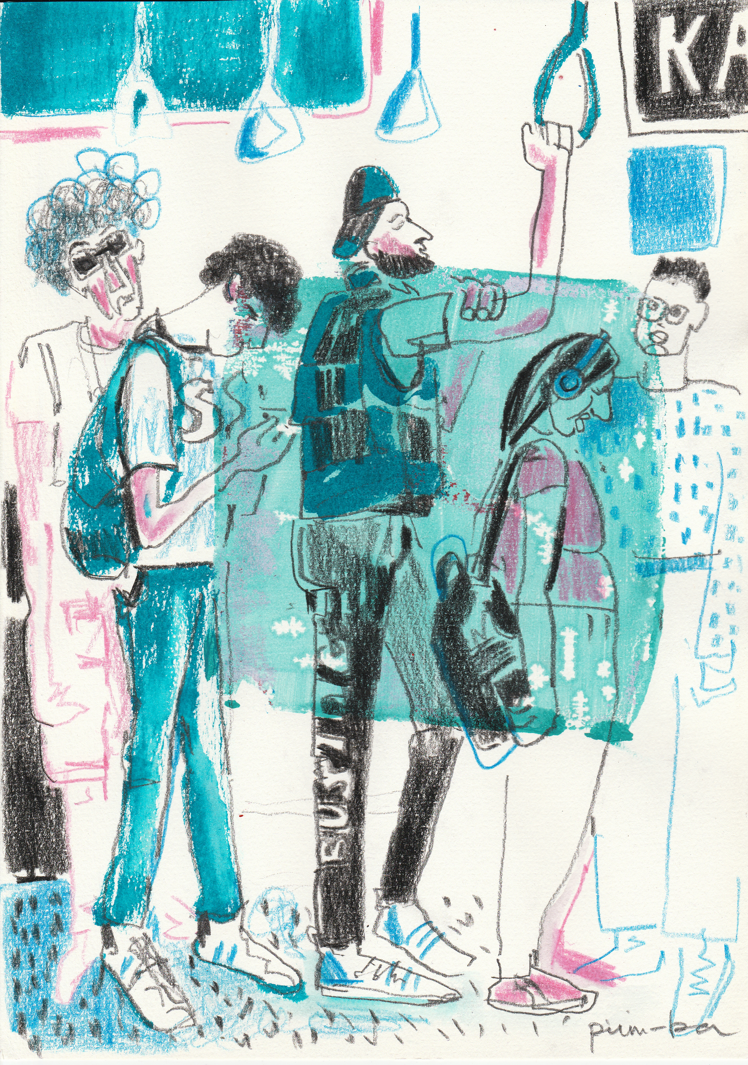 Everyday hustle in motion. A sketch in mixed media capturing the atmosphere of city life through the faces and postures of bus passengers.