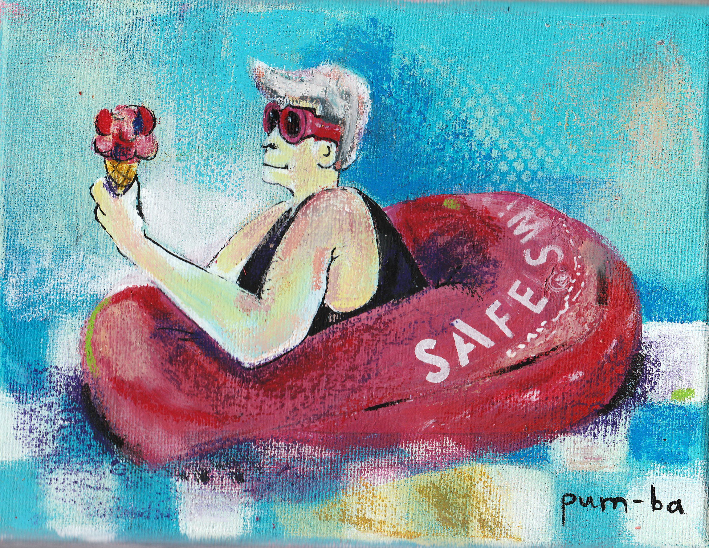Pure summer joy — an old lady floating in a swim ring, savoring ice cream without a care in the world.