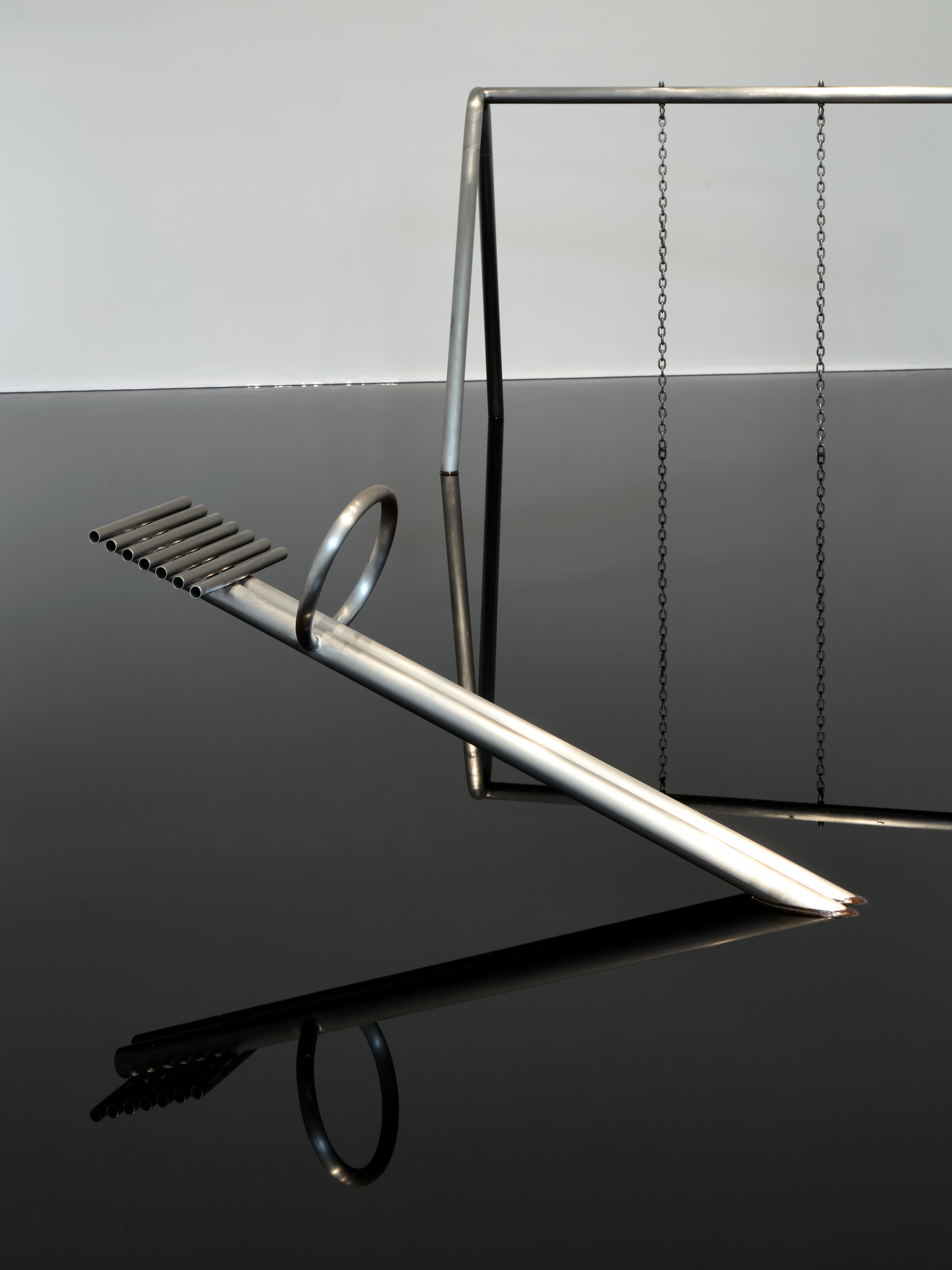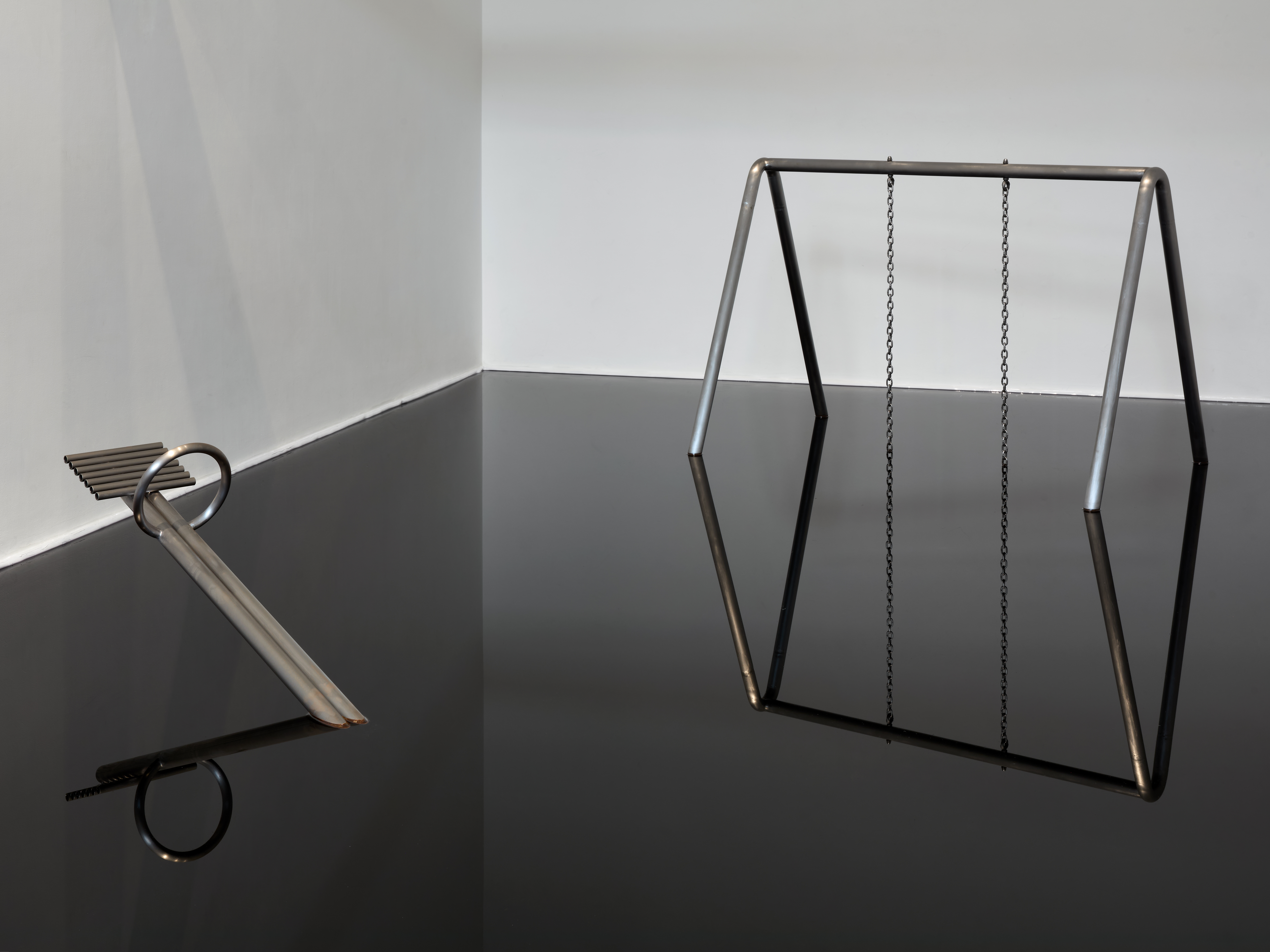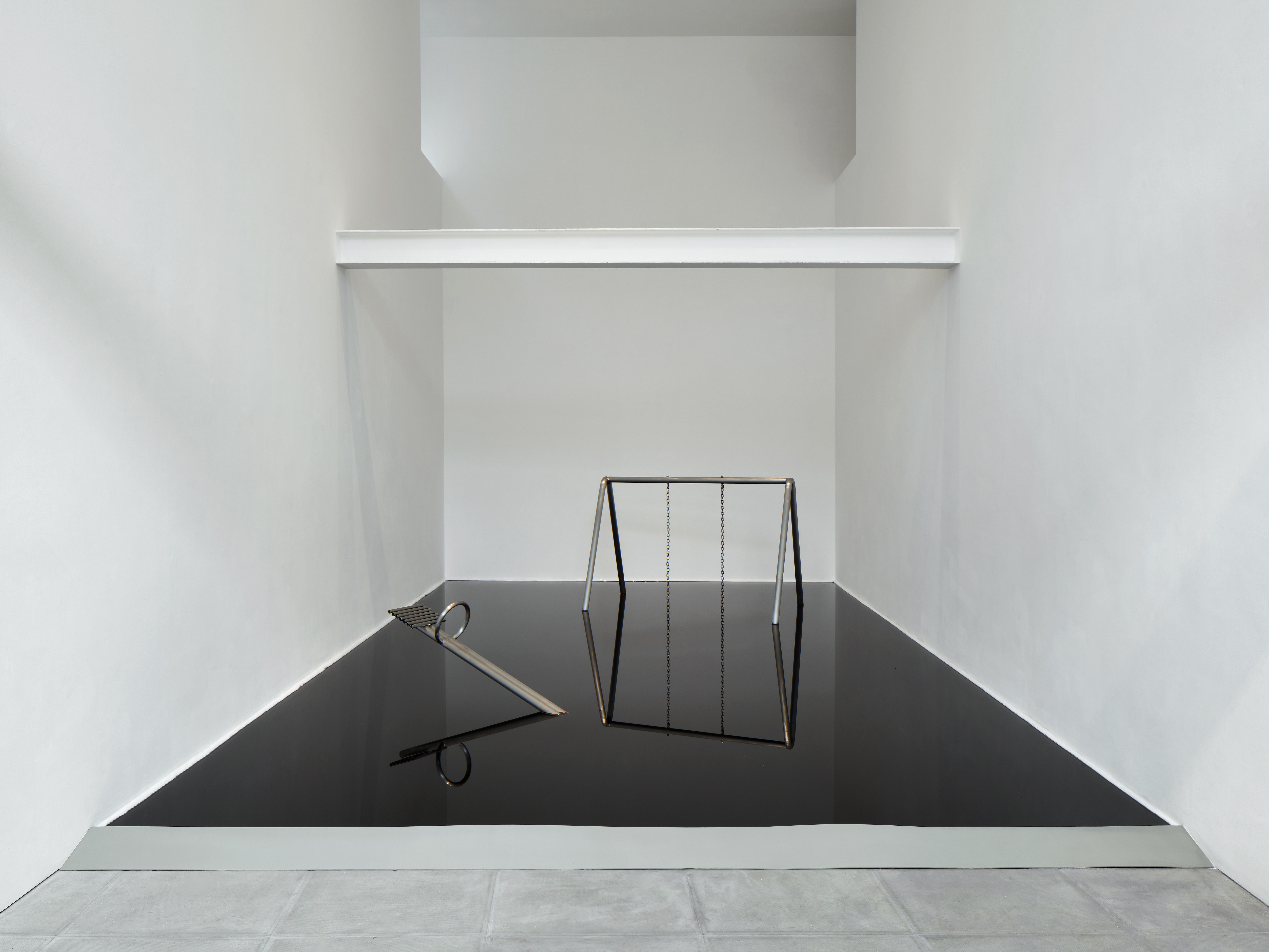 At the center of the lower level is Varvara Uhlik’s installation Play Ground II (2025), consisting of two steel sculptures. Portions of a balance beam and swings emerging above a dark, glossy surface create the sensation of a suspended gesture with palpable inner tension.