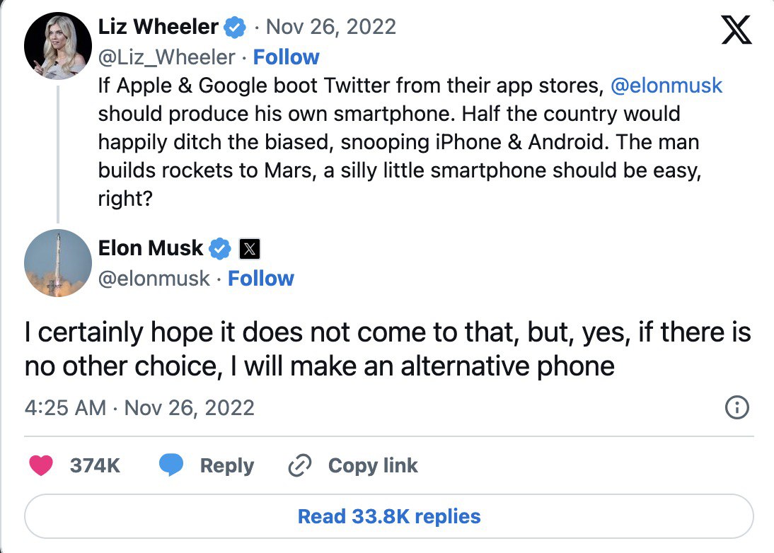 Сам твит, скорее всего, был жестом в сторону компании Apple и её монополии на смартфоны. Примерно в то же время власти США выдвигали претензии яблочной корпорации. В иске говорилось об искусственном завышении цен для потребителей и разработчиков, а кроме того, о скрытых функциях iOS, которые компания Apple якобы добавляет в свои устройства. Вот и Илон Маск решил не остаться в стороне и пошутил на тему того, что может выпустить телефон намного лучше и дешевле айфона.