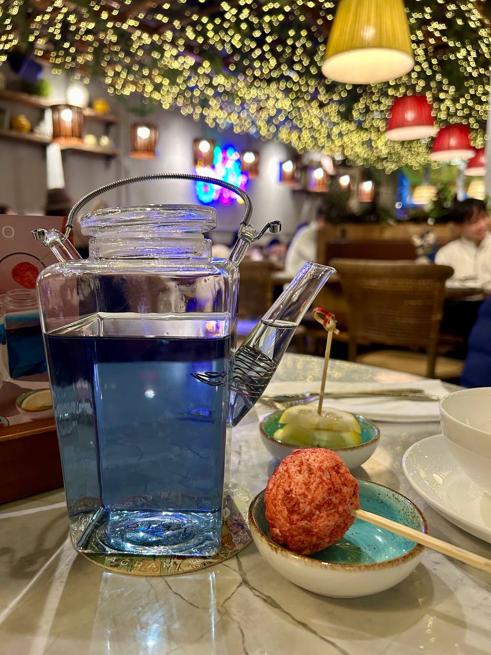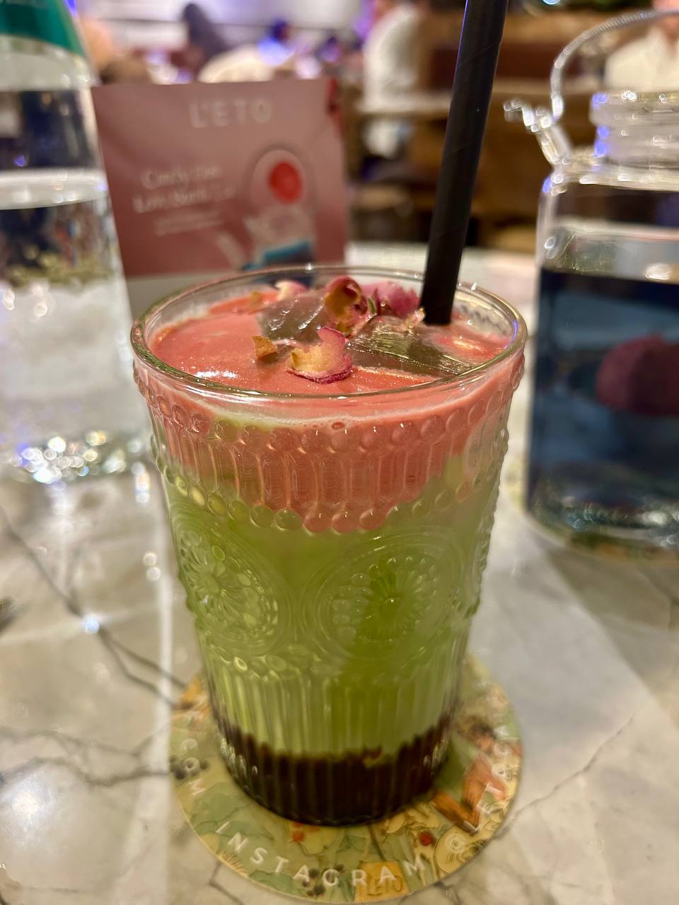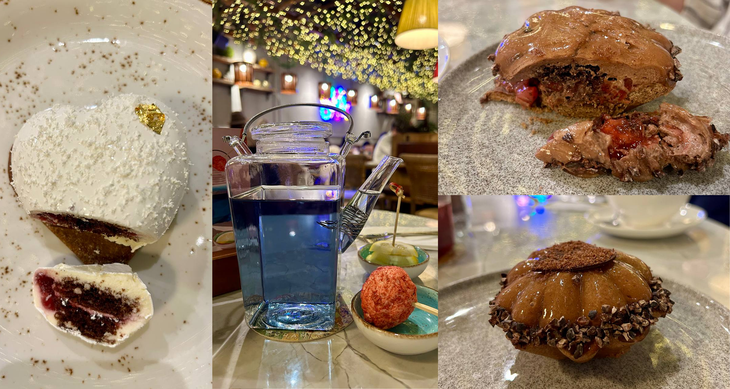 К 14 февраля здесь подавали Berry Kiss Matcha с лепестками роз и мерцающей пеной. Внизу слой ягодной кислинки встречается с мягким чаем матча, а сверху — нежный блеск, как фильтр «влюблённость». Наш второй чай назывался Candy Floss Love Bomb Tea. И «сладкая бомба» там самая настоящая. Опускаешь её в чай, и она моментально «взрывается» яркой кислинкой гибискуса в сладковато-карамельном и ванильном чае «анчан». Чай моментально меняет цвет с синего на розово-фиолетовый. Такое волшебство в чайнике!
