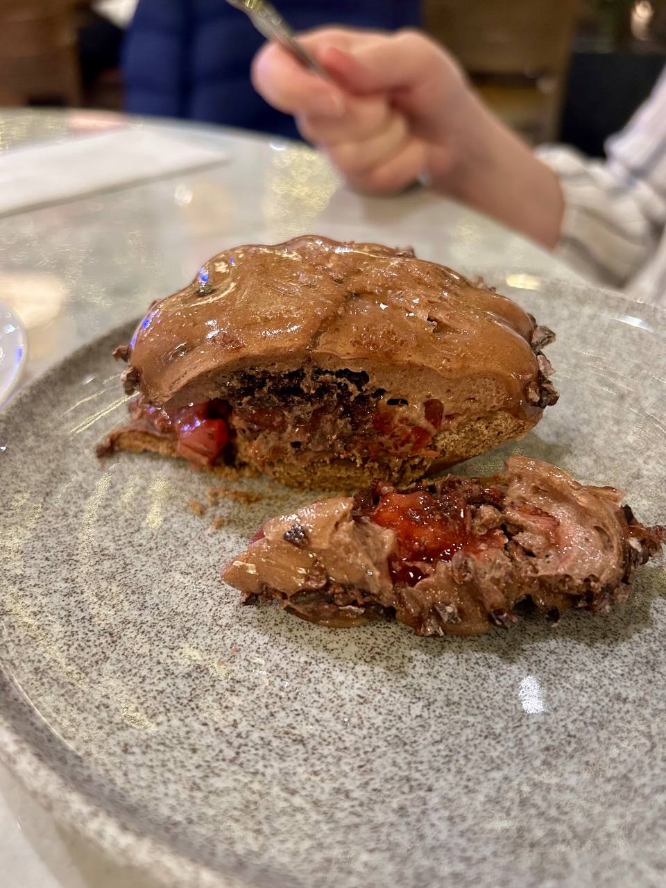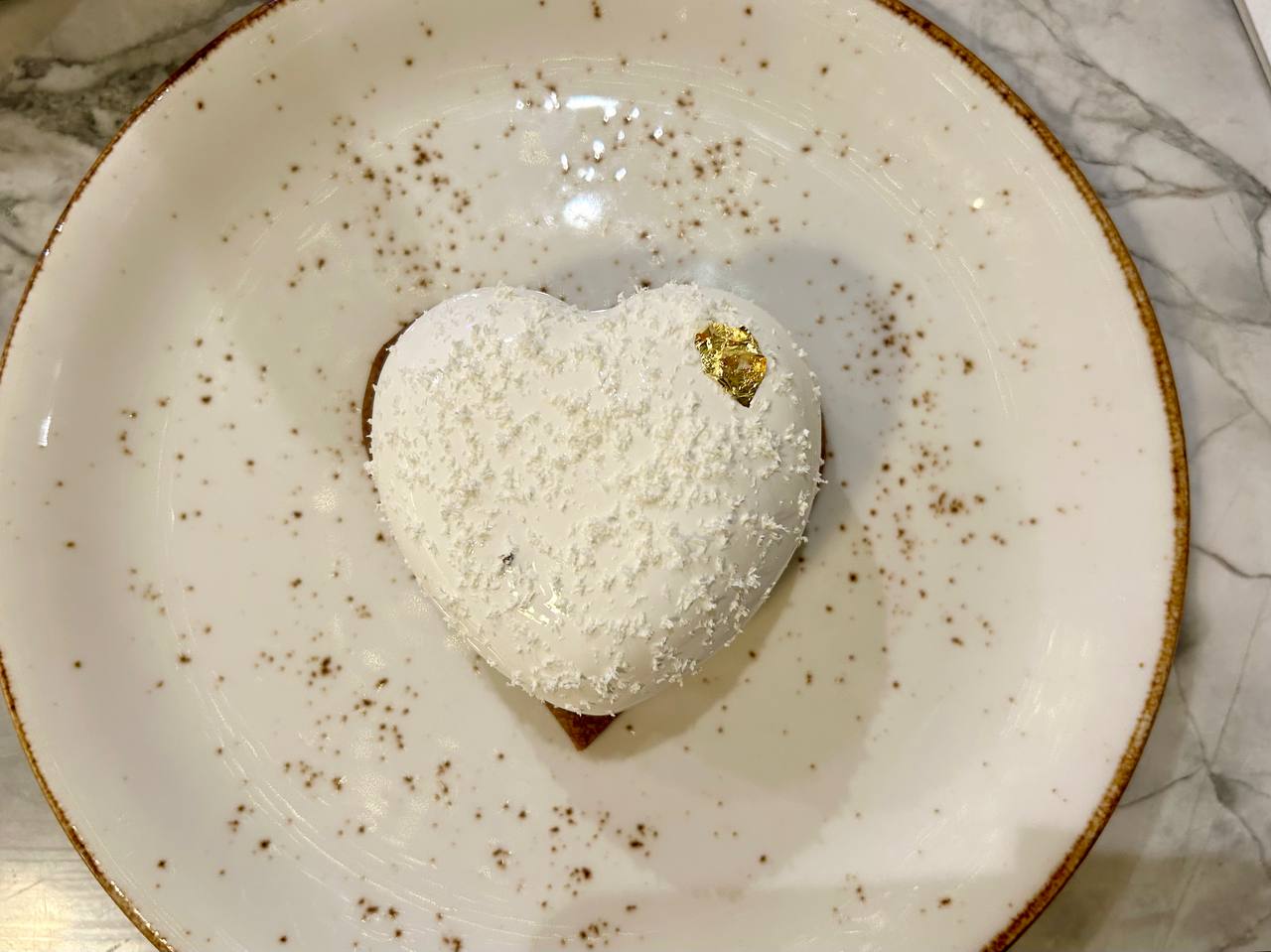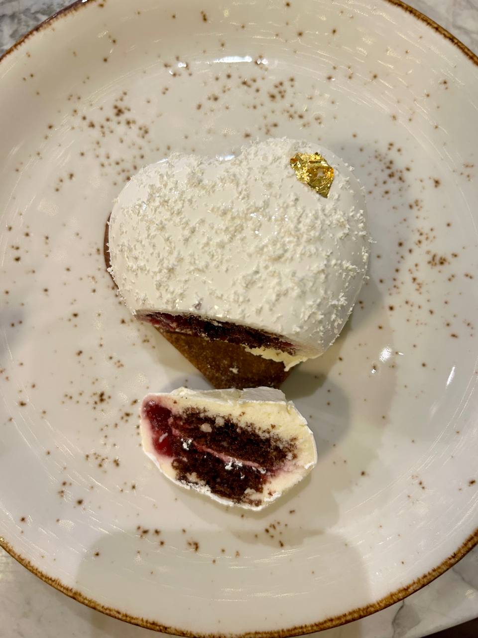 Но главное — десерты. Для начала глянцевое шоколадное сердце Heartbreaker с золотым украшением. Под слоем белого шоколада тёмный бисквит и вишнёвая начинка, сочная, с той самой правильной кислинкой. Разрезаешь — и появляется яркий рубиновый центр. Немного драматично, как и положено в День влюбленных.