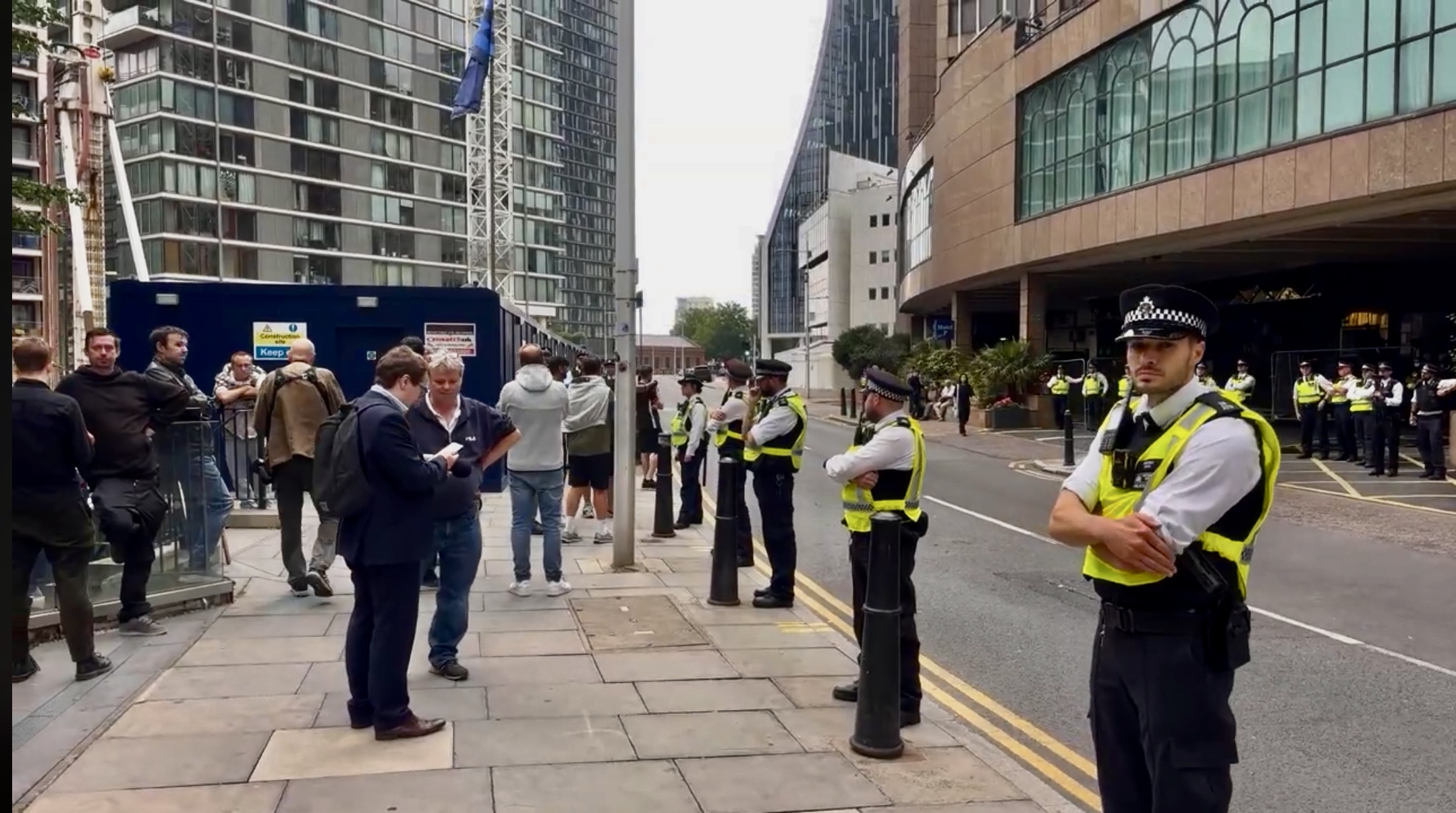 Тем не менее на место событий стянуты силы полиции после того, как вечером во вторник, 23 июля, к отелю на Canary Wharf собрались протестующие — в социальных сетях распространились сообщения о том, что туда тайно перевезли мигрантов из Эппинга. Появилось видео, на котором из окна Britannia бросали яйца, а протестующие, собравшиеся у здания, выкрикивали оскорбления в адрес лидера Лейбористской партии: «Keir Starmer is a w***».