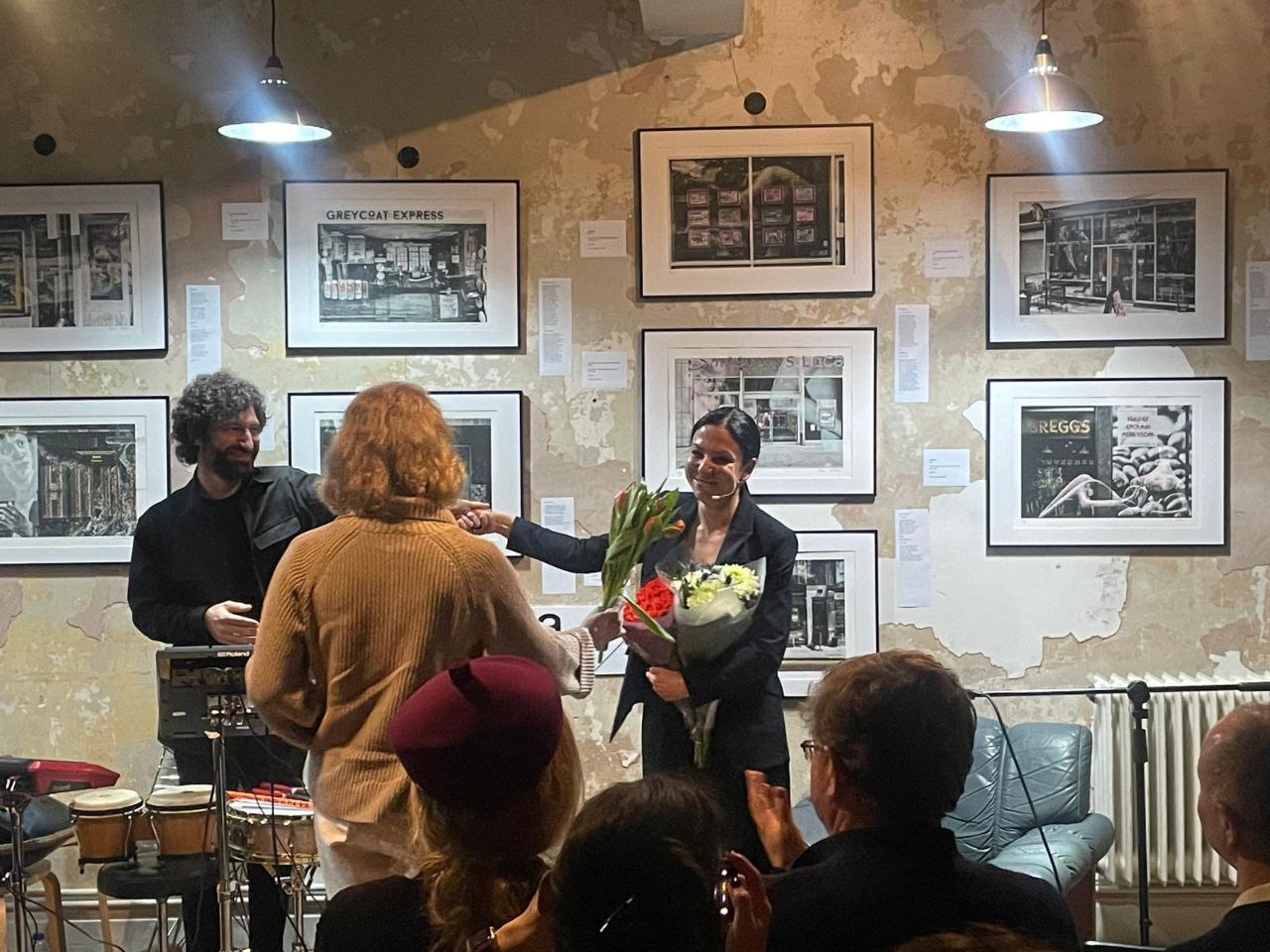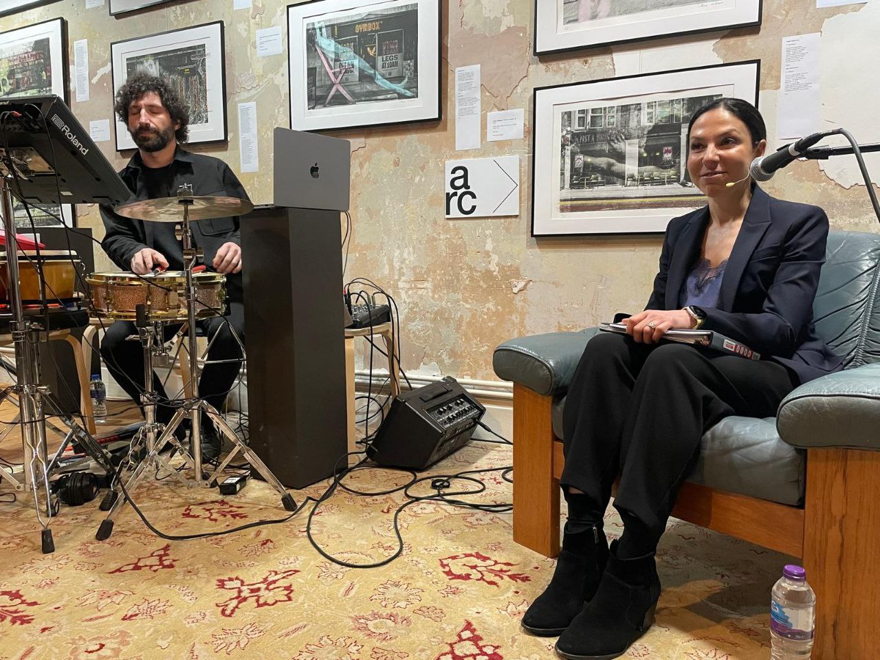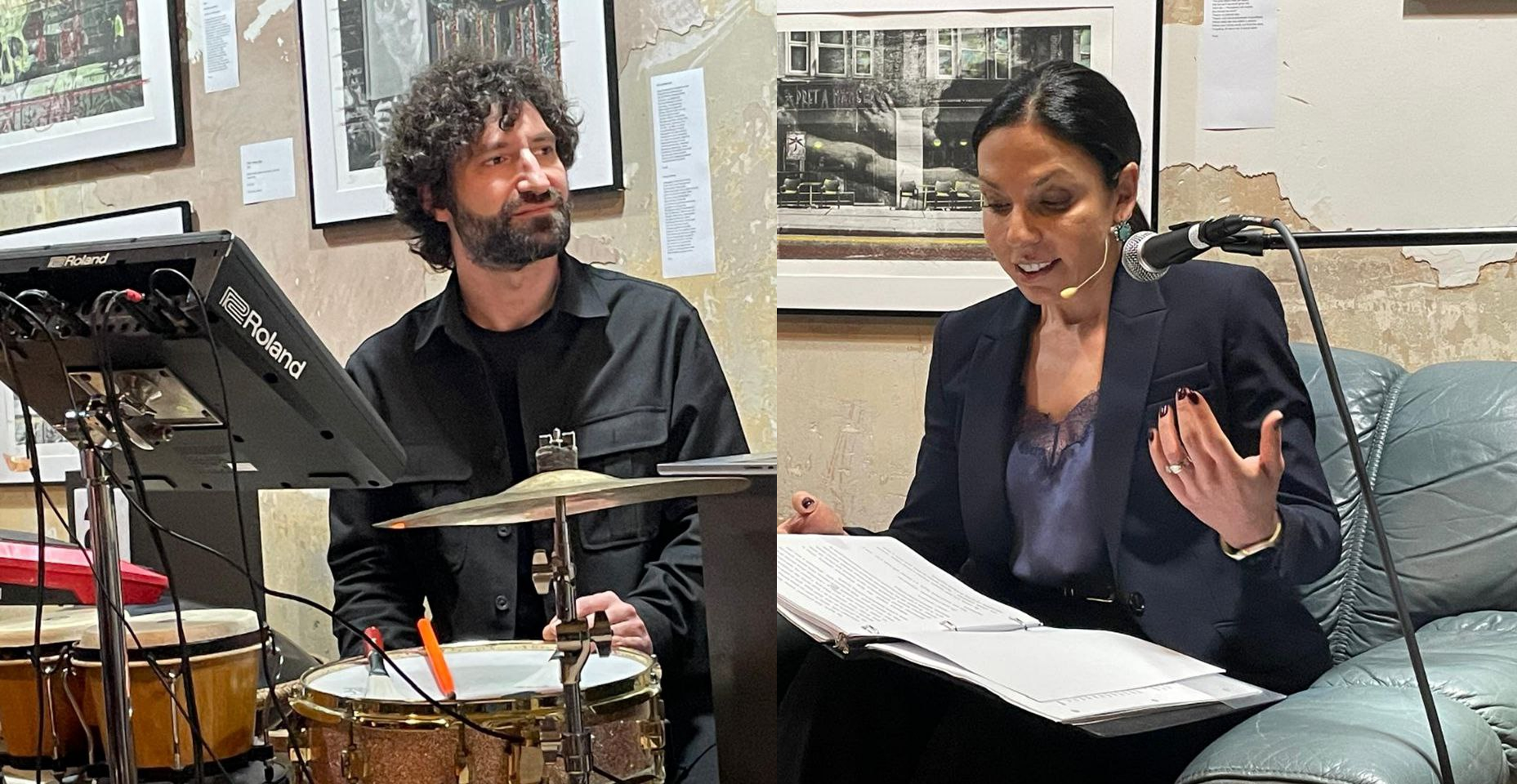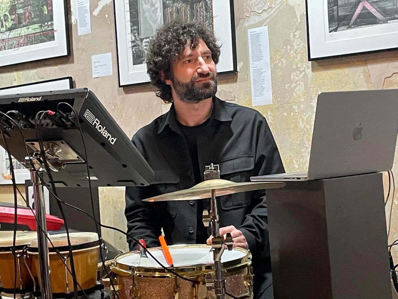 Друг от друга тексты отделены космическими и медитативными звуками ханга, стоящего у колена Евгения Костица. Остальные инструменты — барабан, треугольник, семплер — помогают иллюстрировать звукорядом чтение. Костиц — украинско-греческий музыкант и музыкальный директор (создатель интертейнмент-компании Pulsar ShowLab). Он работает с лауреатами Grammy и Eurovision, играет у Jamala и KAZKA: современный подвижный музыкант, перемещающийся из ипостаси в ипостась без лишних проблем. Так что очевидно: стать иллюстратором вечера для него удовольствие.