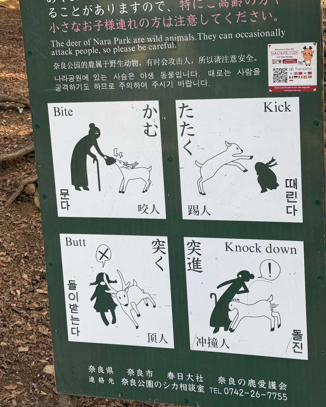 Плакат в Наре добавляет: «Не думайте, что вы сильнее оленя».