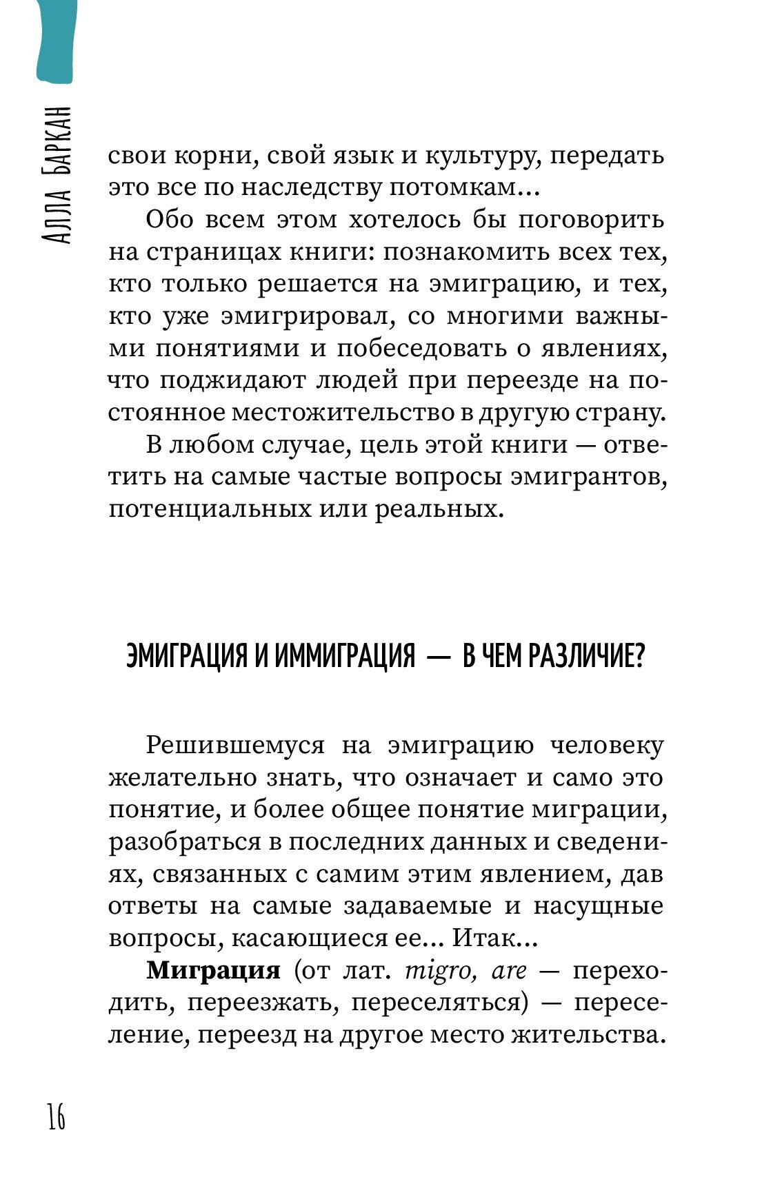 Первая часть трилогии «Настольная книга эмигранта» Аллы Баркан — «Азы эмиграции» — посвящена особенностям подготовки к эмиграционному процессу и жизни в иммиграции.