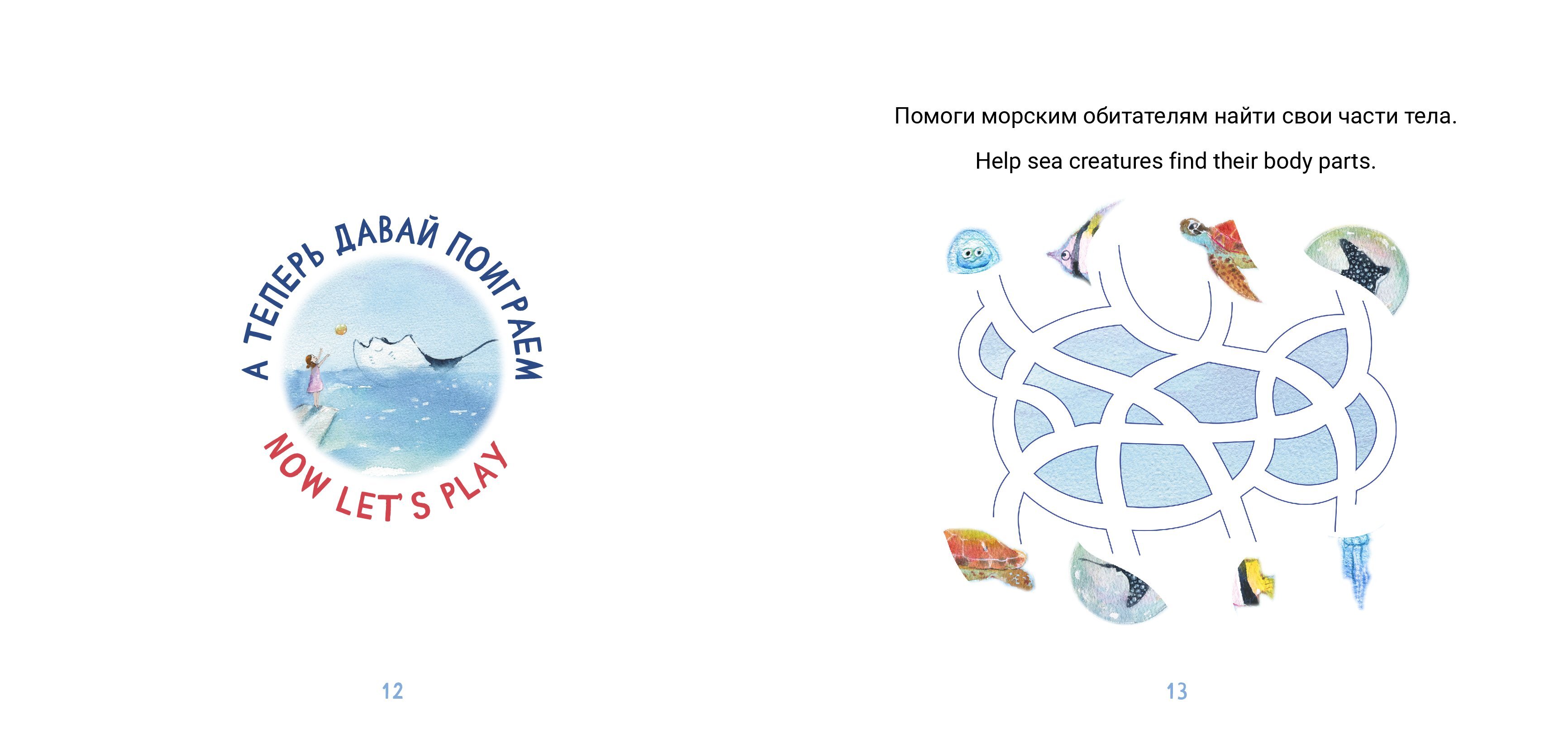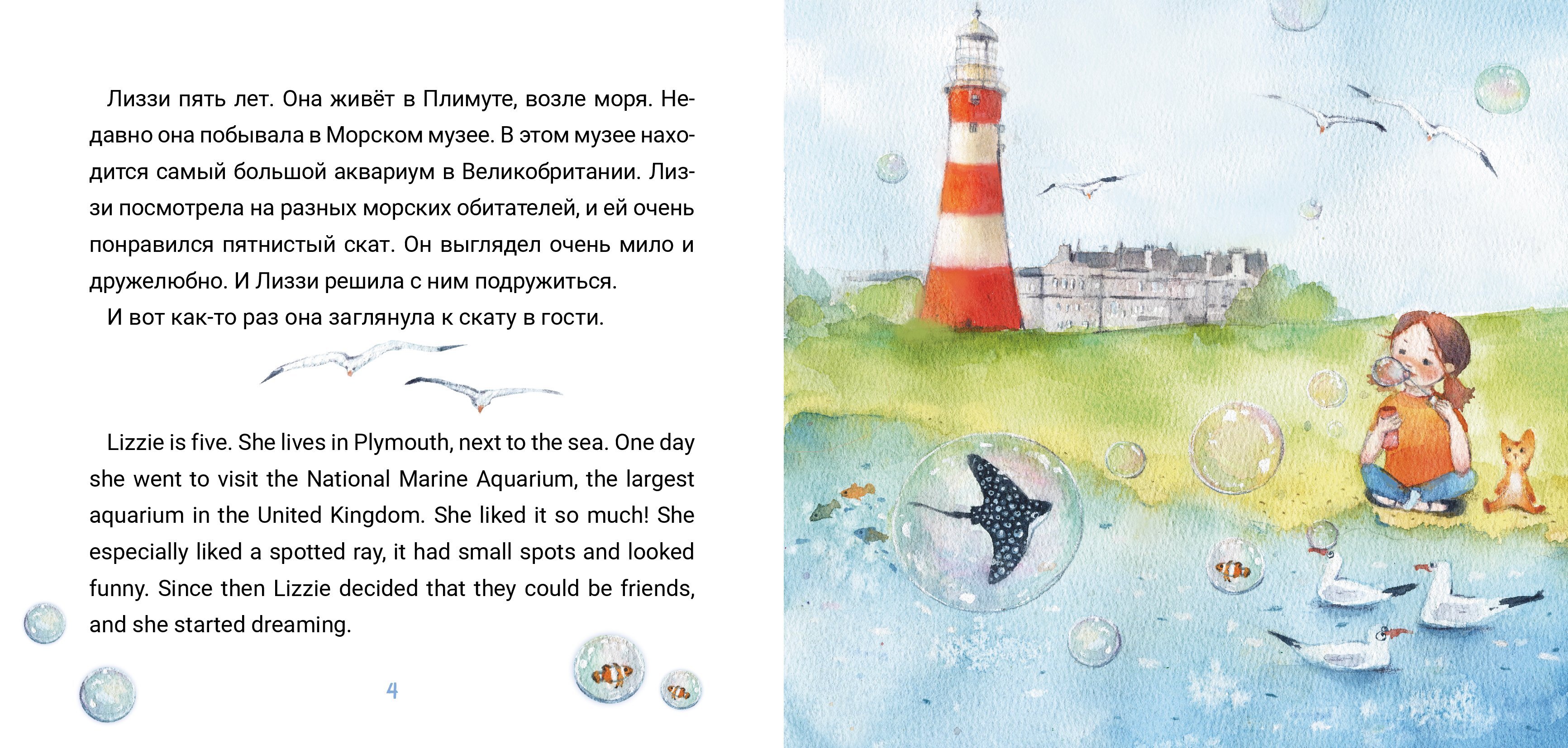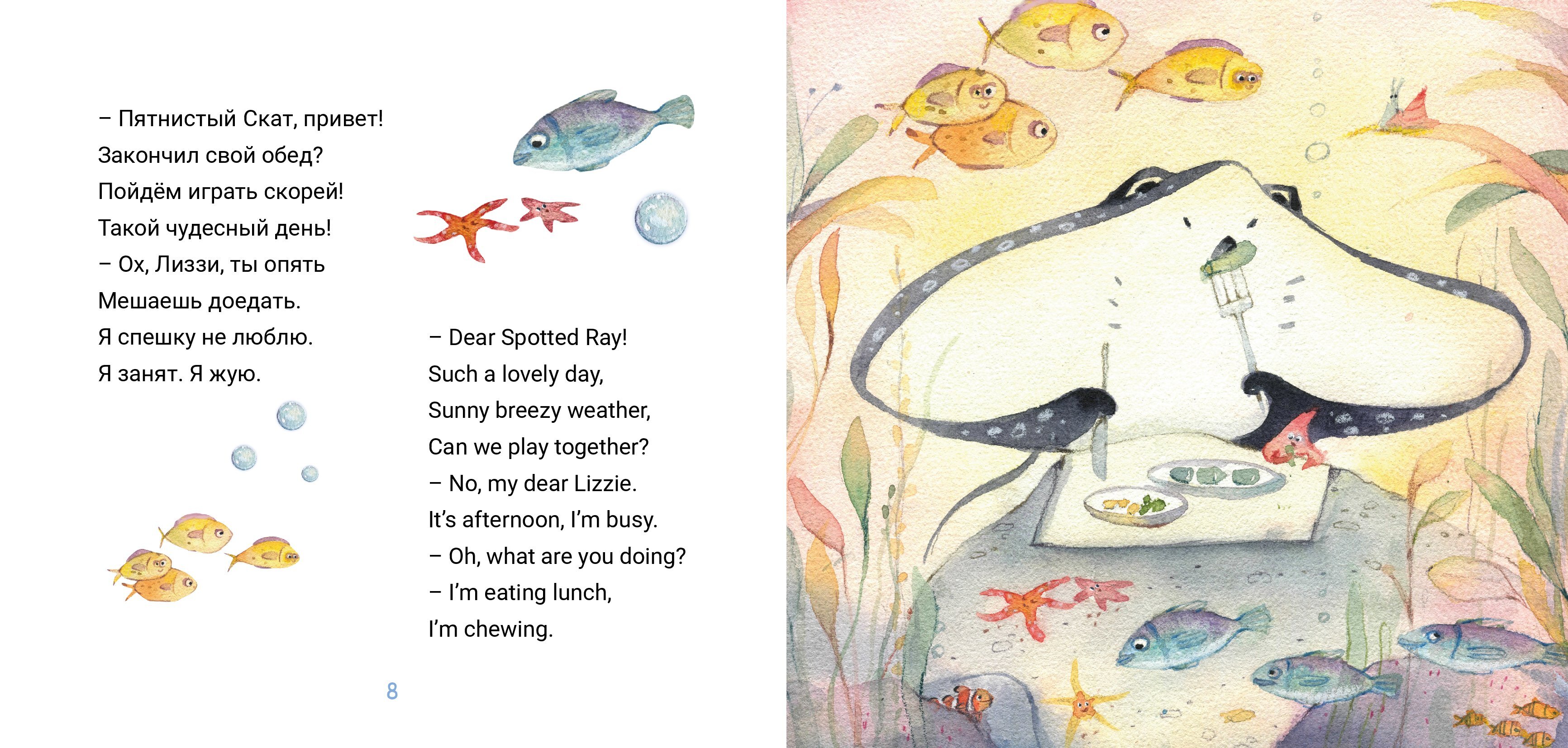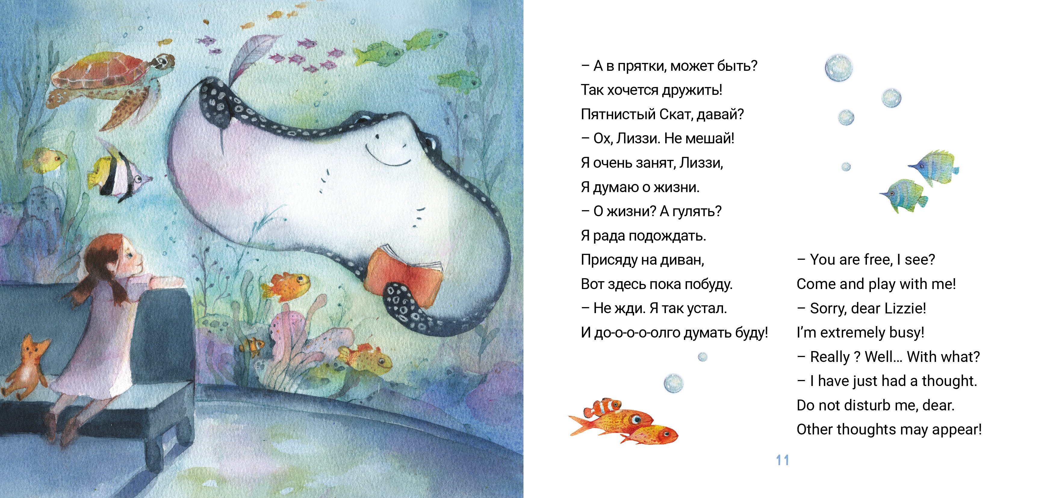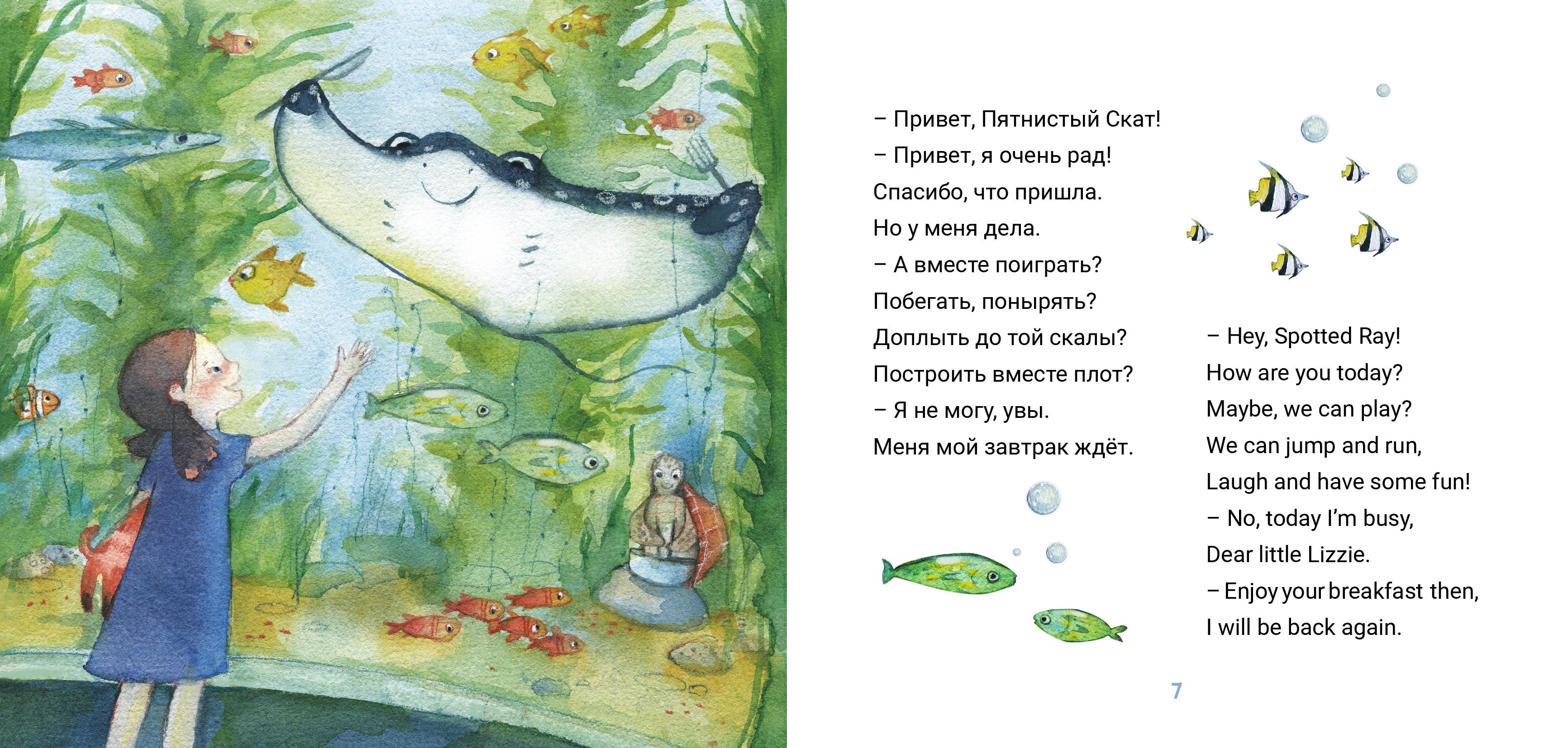 Забавная история в стихах на двух языках синхронно о дружбе пятилетней девочки и ската. Книга с играми и заданиями.