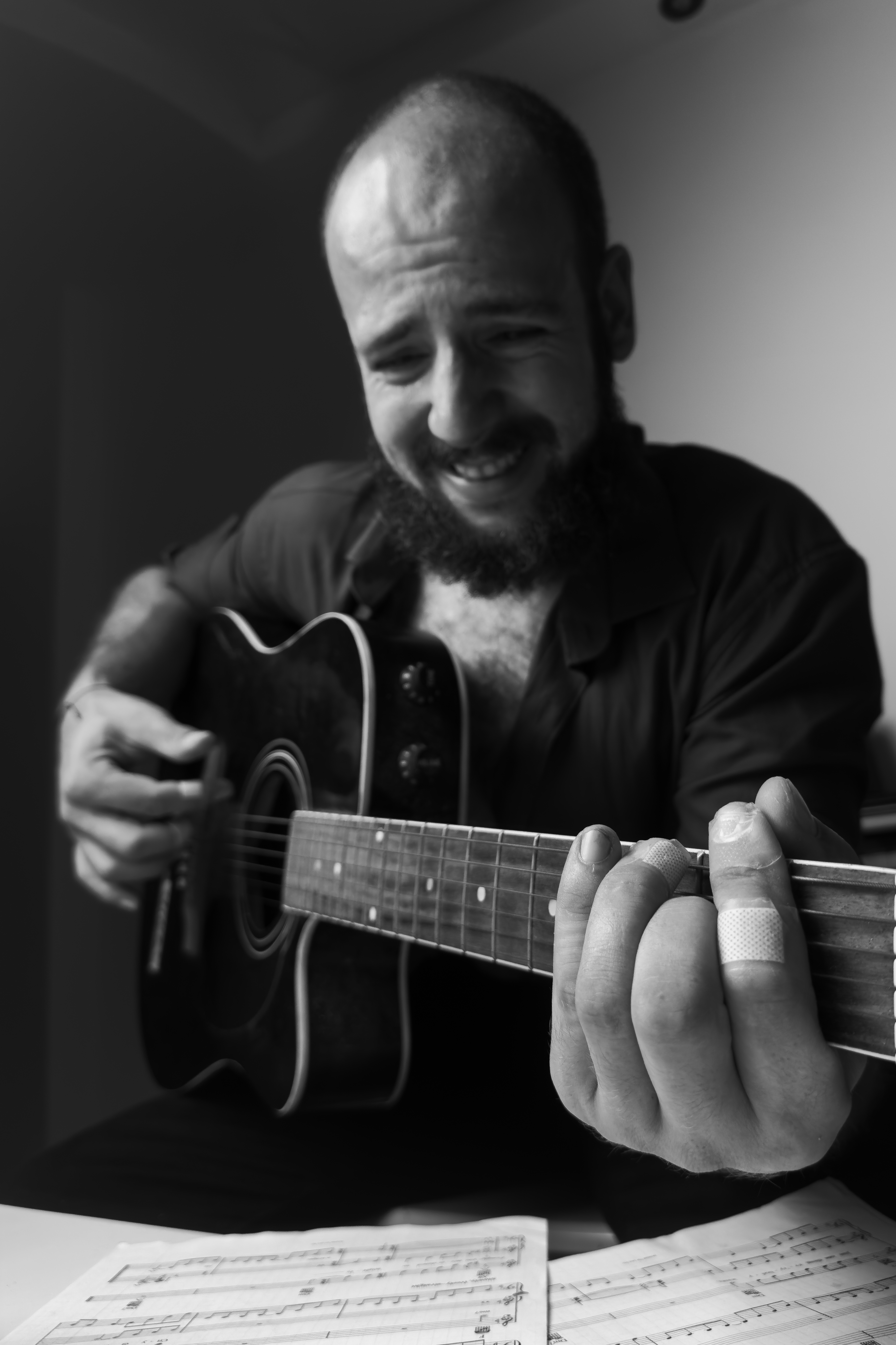 Еще одна работа – с гитарным грифом и лицом, искаженным то ли гримаской боли, то ли усмешкой – автопортрет Михаила Пестряева. На фотографии – начало большого пути: долгое время сломанный палец не позволял фотографу брать в руки любимую гитару, и вот наконец это стало возможно. Спектр эмоций, пластырь на пальце, ворох исписанных нотами листов. Страх, радость, надежда – и любовь.